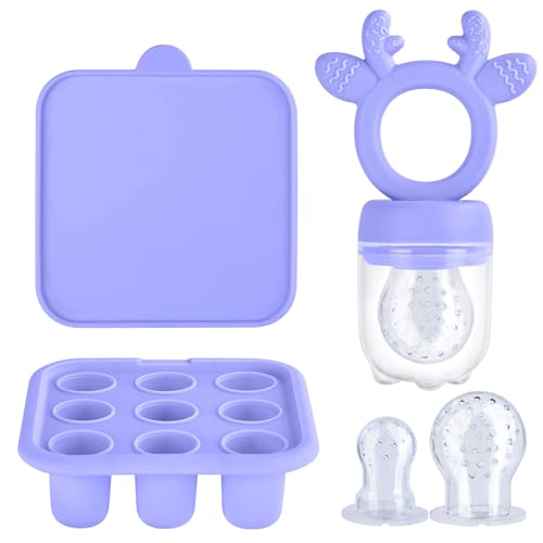 Aolso Bebisnapp med mat, frukt, glassformar för bröstmjölk, för bebisar, BPA-fri silikonmatare för att äta säkert själva, frysbrickor för mat, blå, lila
