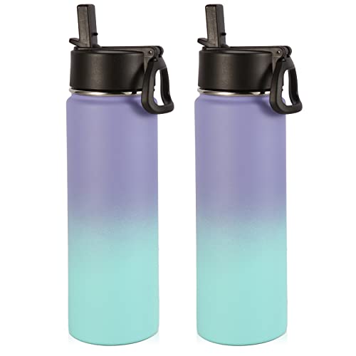Volhoply 530 ml isolerad vattenflaska volym 2-pack, barn rostfritt stål vattenflaskor med sugrörslock, dubbelvägg vakuum metall, bred mun återanvändbar sportflaska för kall dryck (lila, blå, 2