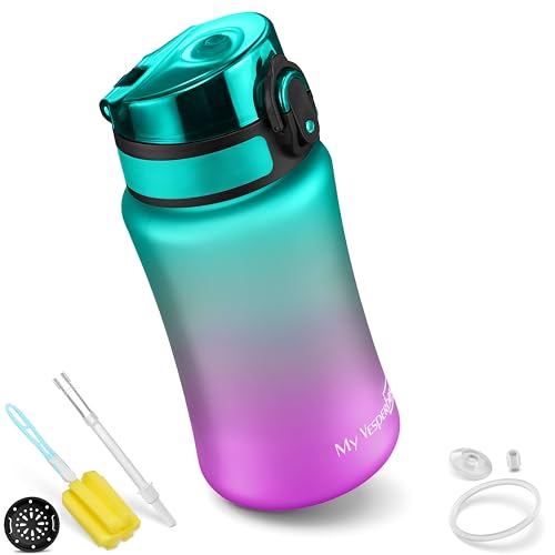 My Vesperbox – Mimmi – drickflaska för barn läckagesäker – 350 ml – med sugrör eller sil – lätt tritan vattenflaska – BPA-fri – för dagis, skola (lila – grön 350 ml)