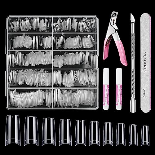 Venares nagelspetsar – 500 genomskinliga falska naglar med 10 storlekar och lim för akryl och gel, fyrkantiga spetsar