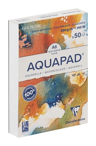 Clairefontaine 975620C Goldline Aquapad limmat block - 50 ark vitt akvarellpapper medium fin A6 10,5 x 14,8 cm 300 g