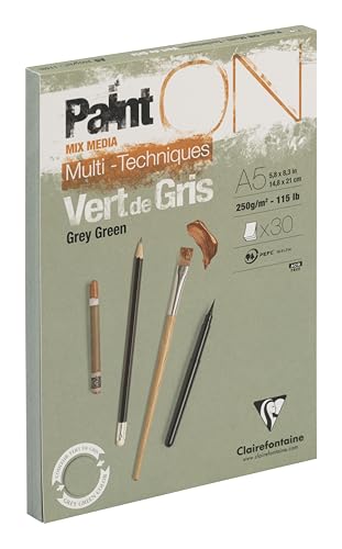 Clairefontaine 975704C Multi-Technical PaintON limmat block - 30 ark multitekniskt ritningspapper med korn - grön grå - A5 14,8 x 21 cm 250 g