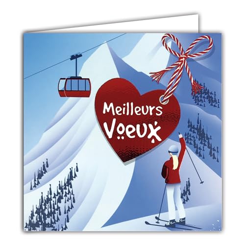 Fyrkantigt kort bästa hälsningar rött hjärta med vitt kuvert 15 x 15 cm - gott nytt år landskap berg vinter snöigt toppmöte linbana linbana skidor skog julgran - tillverkad i Frankrike