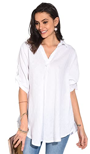 Bonateks Dam tunika 100% linne tillverkad i Italien, V-ringad blus, avtagbar långärmad, vit, storlek: XL, Vitt och blått, XL