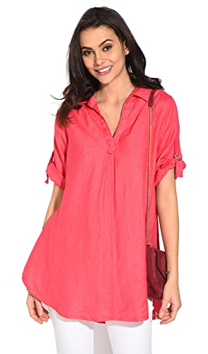 Bonateks Dam 100% linne tunika tillverkad i Italien, V-ringad blus och långärmad, röd, storlek: M, Färg: röd, M