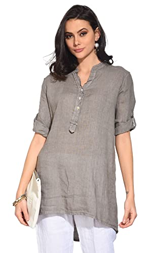 Bonateks Dam 100% linne tunika tillverkad i Italien, tunisisk krage blus med knäppning och långärmad, öken, storlek: M, Öken, M