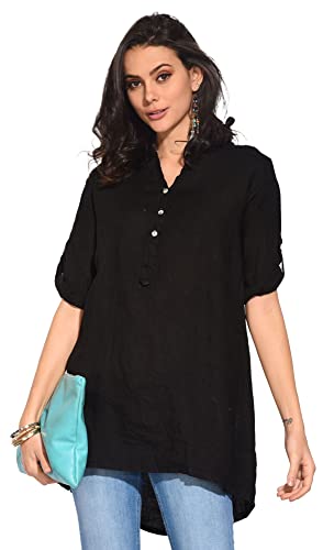 Bonateks Dam 100% linne tunika tillverkad i Italien, tunisisk krage blus med knäppning och långärmad, svart, storlek: XL, svart, XL