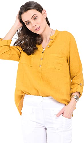 Bonateks Dam 100% linne tunika tillverkad i Italien, tunisisk krage blus med knappar på framsidan, ockra, storlek: M, Ocre, M