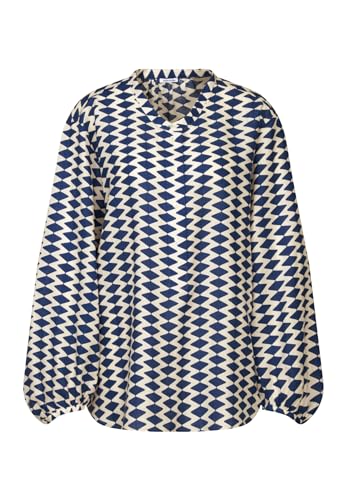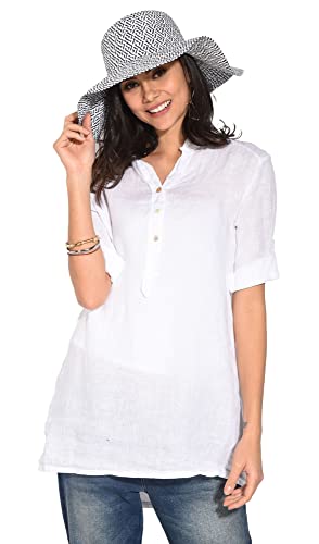 Bonateks Dam 100% linne tunika tillverkad i Italien, tunisisk krage blus med knäppning och långärmad, vit, storlek: L, Vitt och blått, L