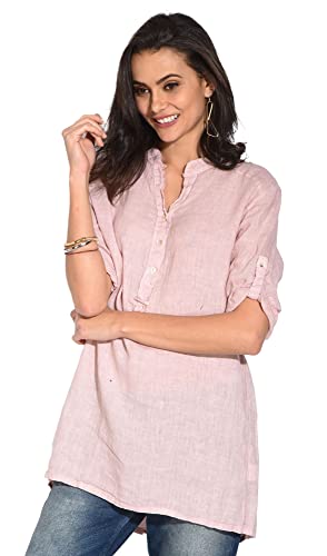 Bonateks Dam 100% linne tunika tillverkad i Italien, tunisisk krage blus med knäppning och långärmad, satin, storlek: M, Satin, M