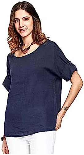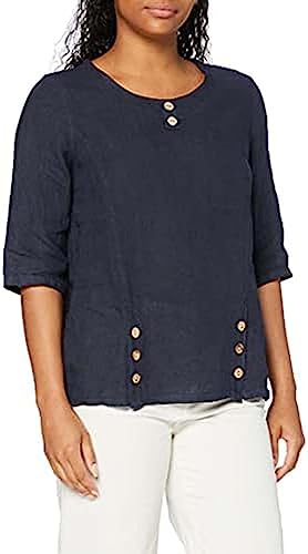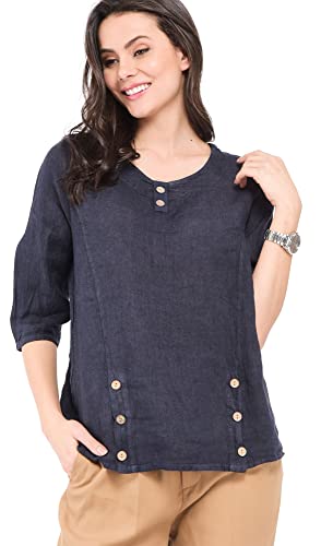 Bonateks Dam 100% linne tunika tillverkad i Italien, rund hals topp med knappar och halvärmar, marinblå, storlek: M, Marin, M