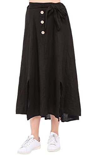 Bonateks Kvinnors kjol 100% linne tillverkad i Italien, lång kjol med knappar med bälte, svart, storlek: XL, svart, XL