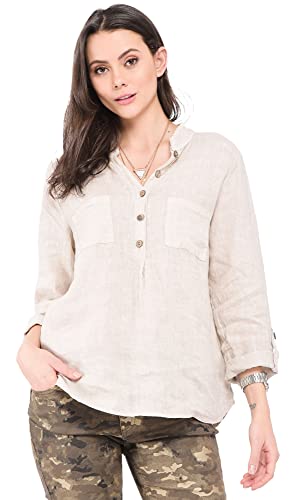 Bonateks Dam tunika 100% linne tillverkad i Italien, tunisisk krage med knappar och långa ärmar med knäppning, öken, storlek: S, Öken, S
