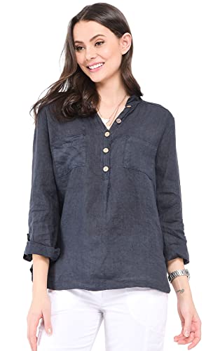 Bonateks Dam 100% linne tunika tillverkad i Italien, tunisisk krage blus med knappar på framsidan, marinblå, storlek: S, Marin, S