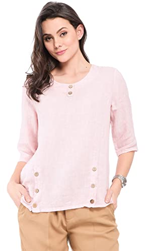 Bonateks Dam 100% linne tunika tillverkad i Italien, rund hals topp med knappar och halvärmar, rosa, storlek: M, rosa, M