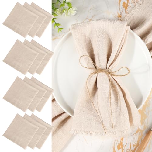 12 stycken tygservetter beige med fransar, 45 x 45 cm linneservetter, bomullsservetter, tyg med 10 m snöre för familjefester, bröllop, födelsedagar