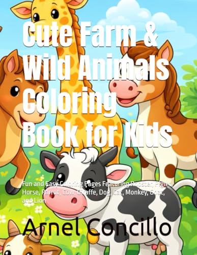 Cute Farm & Wild Animals Coloring Book for Kids: Fun and Easy Coloring Pages Featuring Rooster, Piglet, Horse, Parrot, Cow, Giraffe, Dog, Cat, Monkey, Goat, and Lion