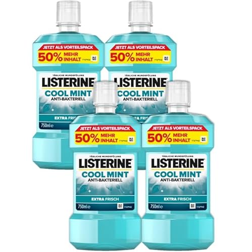 LISTERINE Cool mint munvatten (4 x 750 ml), antibakteriell munsköljning med eteriska oljor & intensiv mintsmak, tandvårdsbalsam minskar plack och effektivt bekämpar dålig andedräkt