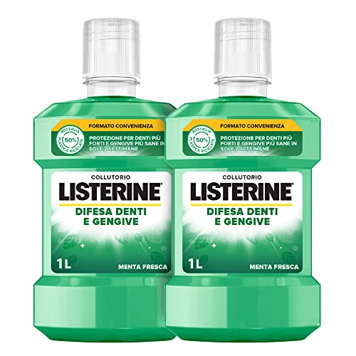 LISTERINE Munvatten Försvar Tänder och tandkött, delikat smak av färsk mynta, munvatten inflammerat tandkött för starka tänder, med fluor, munhygien för friskt tandkött, 2 x 1 l förpackning