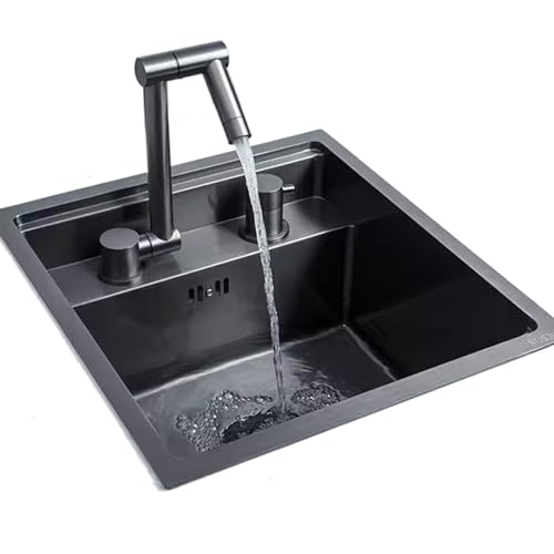 BIGYOUZI Diskbänk 304 rostfritt stål diskho kan vara en skål handfat eller dubbel skål diskho med dränering och litet diskho, koppbricka och tvåldispenser (80 x 46 x 22 cm, svart grå)