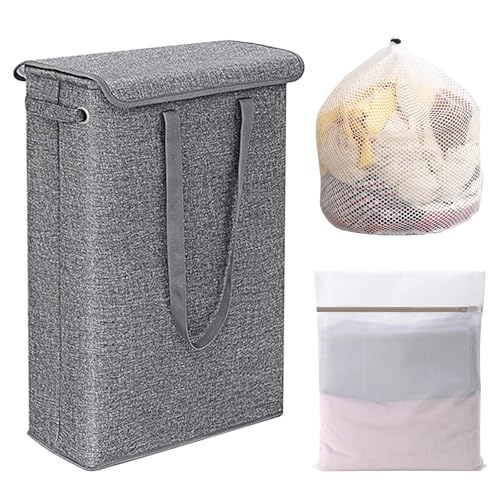 Oungy Vikbar tvättkorg grå med lock, 45 l tvättkorg smal och hög, smal tvättkorg med handtag, liten tvättkorg med 2 st. tvättpåsar för badrum och sovrum, 60 x 39 x 19 cm