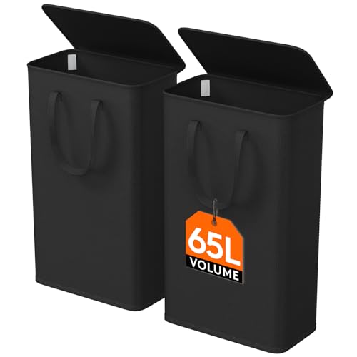 Lifewit 65 liter smal tvättkorg, liten tvättkorg med lock, hopfällbar korg för smutstvätt, korg med förlängda handtag för enkel transport, höga tvättkorgar för sovrum, tvättstuga, Svart, 2-pack