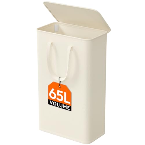 Lifewit 65 liter smal tvättkorg, liten tvättkorg med lock, hopfällbar korg för smutstvätt, korg med förlängda handtag för enkel transport, höga tvättkorgar för sovrum, tvättstuga, Vit, 1-pack