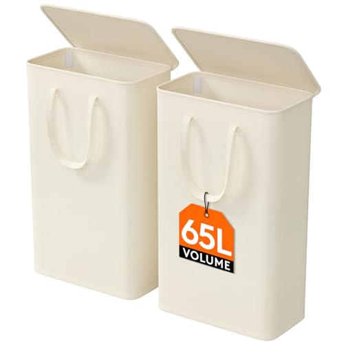 Lifewit 65 liter smal tvättkorg, liten tvättkorg med lock, hopfällbar korg för smutstvätt, korg med förlängda handtag för enkel transport, höga tvättkorgar för sovrum, tvättstuga, Vit, 2-pack