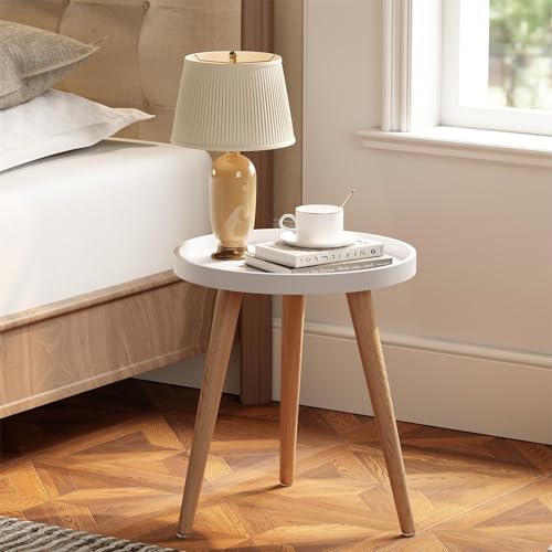 APICIZON Sidobord vitt rund, litet bord, 38 x 45 cm, vardagsrumsbord, nattduksbord med ben av massivt trä, skandinavisk stil, litet soffbord trä för sovrum, balkong