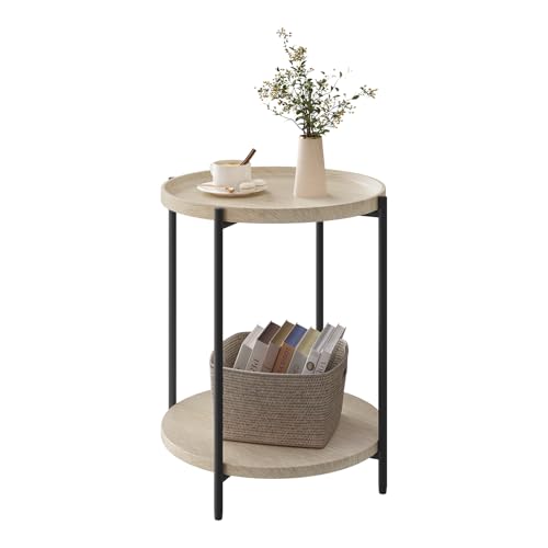 WOLTU Runt soffbord, litet sidobord med 2 hyllor, för vardagsrum sovrum, MDF + metall, lätt ek, BTS06hei
