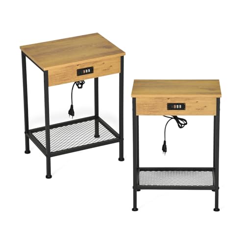 MEUBLE COSY nattduksbord, set om 2 med laddningsstation, sidobord, 4 USB-portar, soffbord, litet soffbord med hyllor för vardagsrum, sovrum, industri, metallram, ljusbrun, 38 x 28 x 52 cm