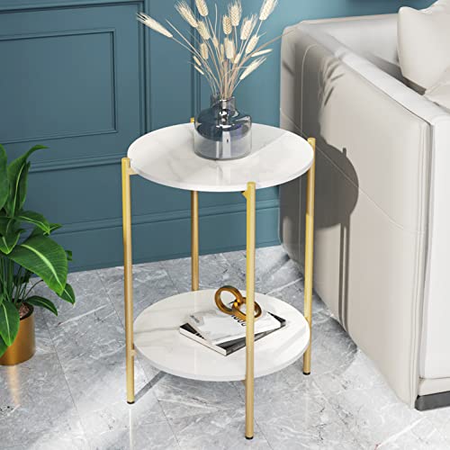 Guld Sidobord Med 2 Nivåer - Runt Sängbord, Diameter 40,5 cm, Marmor Med Lyxig Guldram, Nordiskt Litet Soffbord för Hörn, Växter, Soffa - Hem, Kontor