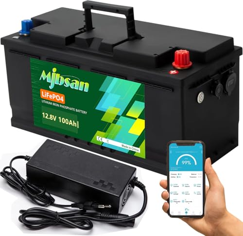 Mjbsan 12 V 100 Ah LiFePO4-litiumbatteri, djupcykelsbatteri, inbyggd 100 A BMS, 1 280 W utgångseffekt för husbilar, solanläggningar, marin, energilagring hemma och oberoende av nät (2-pack)