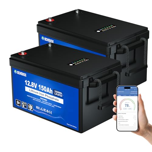 DCHOUSE 2-Pack 12V 150AH LiFePO4 Bluetooth Litiumbatteri Med SOC-Ljus & BMS-Display, Lågtemperaturskydd, Djupcykel Litiumbatteri, För Husbilar, Solcellsystem, Husvagnar
