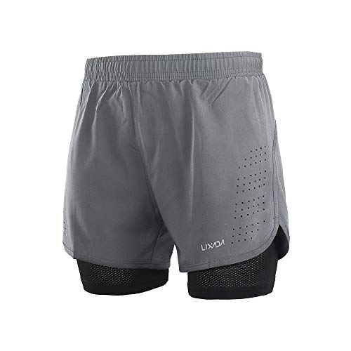Lixada Män 2 i 1 löparshorts snabbtorkande andningsbara aktiv träning jogging maraton cykelshorts, Grå, M