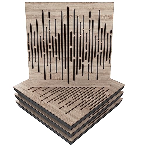 Ljudabsorberande akustisk panel, ”Wave”, 50 x 50 x 5 cm, absorption, diffusion, reflektion, ljudisolering, isolering, 4-pack, trä, perforerad, laminerad: (Wave, Sonoma)