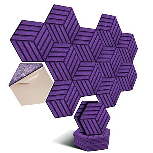 Sexkantiga självhäftande akustikplattor, 12 stycken, ljudisolering med hög densitet, för vägg, tak, trä och dörr – akustikpanel, ljudisoleringsplattor, 30 x 26 x 0,9 cm, ränder, lila