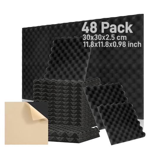 Ohuhu Akustiskt skum, akustiska paneler, 48 stycken med klistermärken, 30 x 30 x 2,5 cm, ljudisolering för vägg, ljuddämpande skumplattor, ljudisolering för musikstudio, podcasts, speldekoration