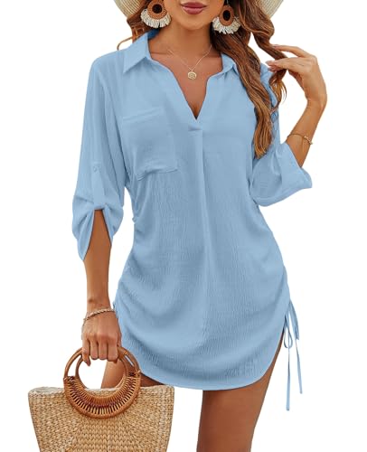 NLAND strandklänning för kvinnor bikini täcka upp V-hals strand poncho sexig strandklänning lång blus elegant sommarklänning strandkläder, Ljusblå, one size