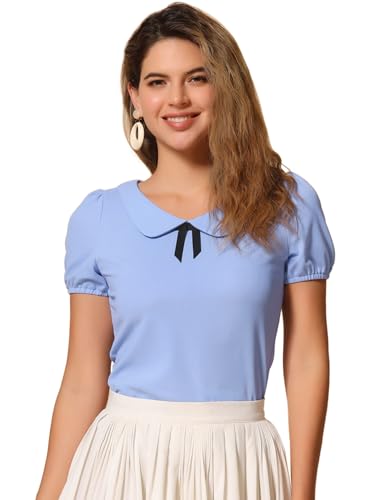 Allegra K dam rockabilly blus med bubikrage 50-talet topp kortärmad rund hals vintage blus enfärgad retro, ljusblå, S