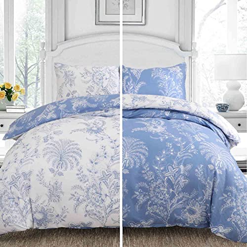 ETDIFFE Påslakan, Queen size-storlek, 3 delar, vändbart, bondgård, botaniskt blommönster, tryckt mikrofiberpåslakan, estetiskt, mjukt och lätt, ljusblå och vit