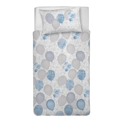 PENSIERI DELICATI Påslakanset för enkelsäng 100% bomull, komplett med säck 155 x 200 cm och 1 örngott 52 x 82 cm, tillverkat i Italien, maskintvättbart påslakan i 40°, mönster ljusblå ballonger