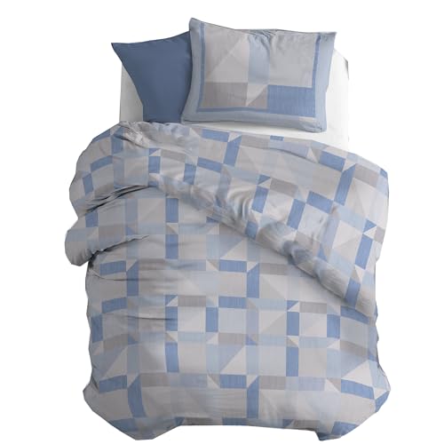 Påslakanset i 100% naturlig bomull, tillverkad i Italien - Set med påslakan - Täckeöverdrag 200 x 200 cm med dubbel patell och örngott, mellanstor kvadrat, ljusblå/ljusgrå