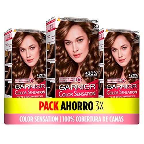 Garnier färgsensation 3-pack: levande och hållbar färg, full täckning av grått hår, enkel applicering med skål och pensel, mjukt och silkeslent hår, 5,0 ljusbrun