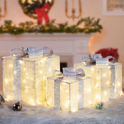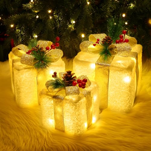Quntis 3 Set LED Presentlåda Jul, Juldekoration Inomhus Strömdriven, 60 Varmvita LED-lampor, Upplyst låda, Ljusdekoration för Julgransfönster tröskel Trädgårdsfönster Flannel