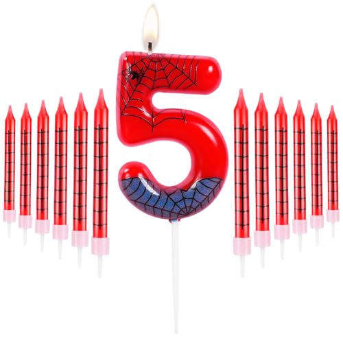 URAQT Födelsedagsljus 3D-form, blå röda ljus med spindelväv, spindel födelsedag nummer 5 ljusdekoration, lämplig för spindeltema födelsedag årsdag bröllopsfest examensfest