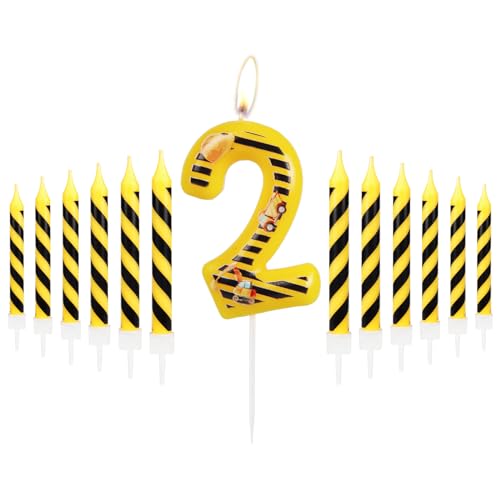 Konstruktion födelsedagsljus, födelsedagsnummer 2 ljus med gula och svarta ränder ljus för tårta, grattis 2:a födelsedagen tårta ljusdekoration för pojkar konstruktion födelsedagsfest tillbehör