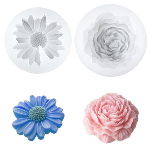 JIYIN 2 stycken ljus silikonformar, 3D pion tusensköna silikon ljusform silikonformar gjutformar silikon blommor ljusgjutformar för doftljus tvål gör-det-själv-tillverkning (Daisy+ pion)
