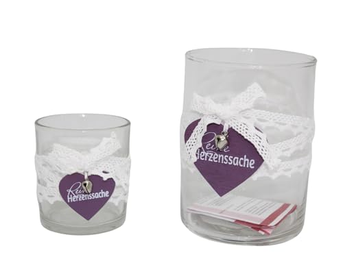 Set med 2 runda ljushållare i glas med lila trähjärta 10 x 10 x 15 cm