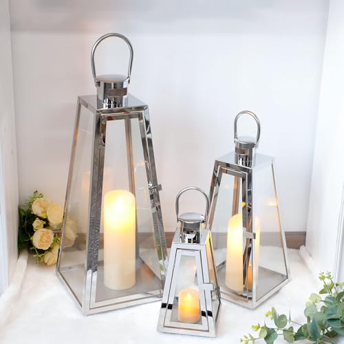 TRIROCKS Set med 3 Stållyktor 54/40/27,5 cm Hög, Metalldekor Ljushållare med Härdat Glas för Heminredning, Vardagsrum, Borddekoration Inomhus och Utomhus (Silver)